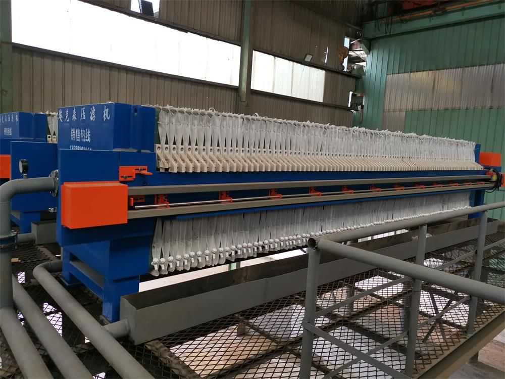 液壓廂式壓濾機由交替排列的濾板和濾框構成一組濾室。濾板的表面有溝槽,其凸出部位用以支撐濾布。濾框和濾板的邊角上有通孔,組裝后構成完整的通道,能通入懸浮液、洗滌水和引出濾液。板、框兩側各有把手支托在橫梁上,由壓緊裝置壓緊板、框。板、框之間的濾布起密封墊片的作用。由供料泵將懸浮液壓入濾室 在濾布上形成濾渣,直至充滿濾室。濾液穿過濾布并沿濾板溝槽流至板框邊角通道,集中排出。過濾完畢,可通入清洗滌水洗滌濾渣。